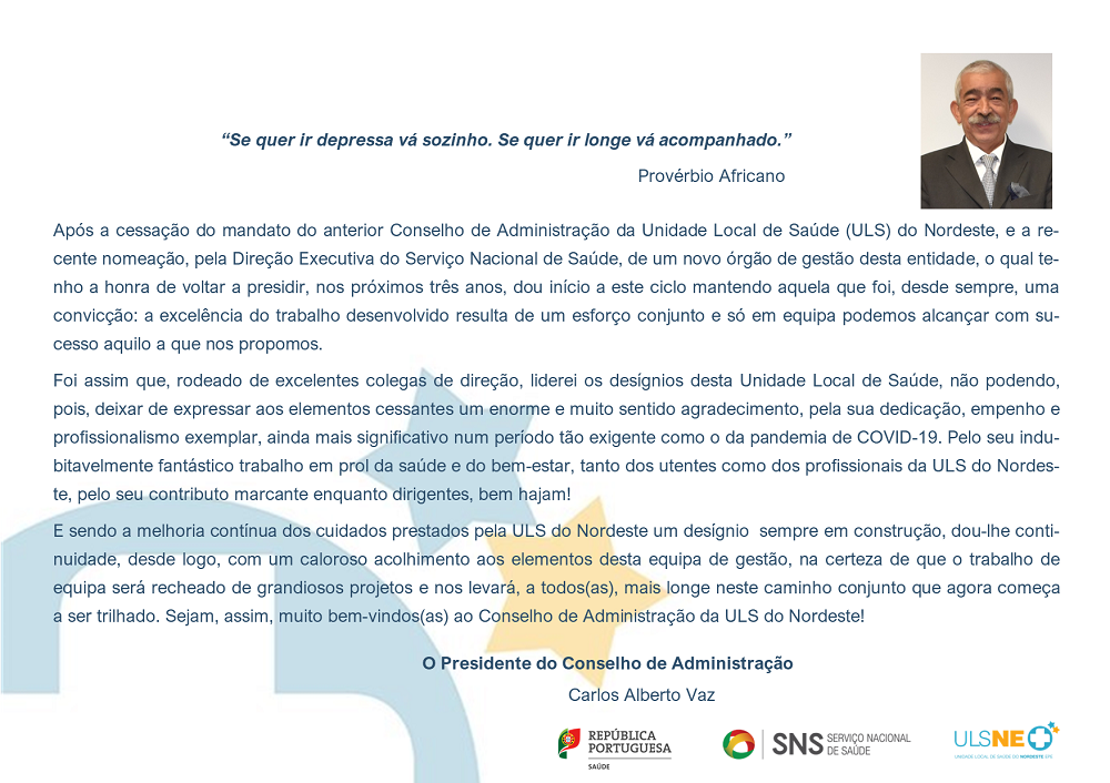Foi nomeado pela Direção Executiva (DE) do Serviço Nacional de Saúde (SNS), para um mandato de três anos (2023-2025), o Conselho de Administração da Unidade Local de Saúde (ULS) do Nordeste, encontrando-se já em funções desde o dia 1 de setembro.